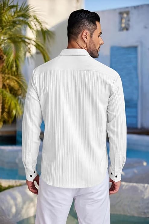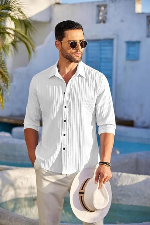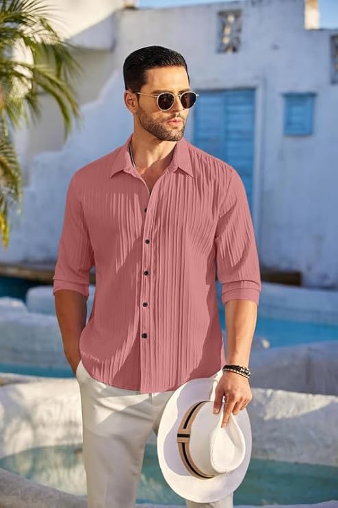The vertical crinkle texture adds depth and uniqueness, making it stand out from regular plain shirts. The peach variant offers a warm, relaxed, and fashionable summer vibe, while the white variant gives a clean, sharp, and high-end aesthetic.